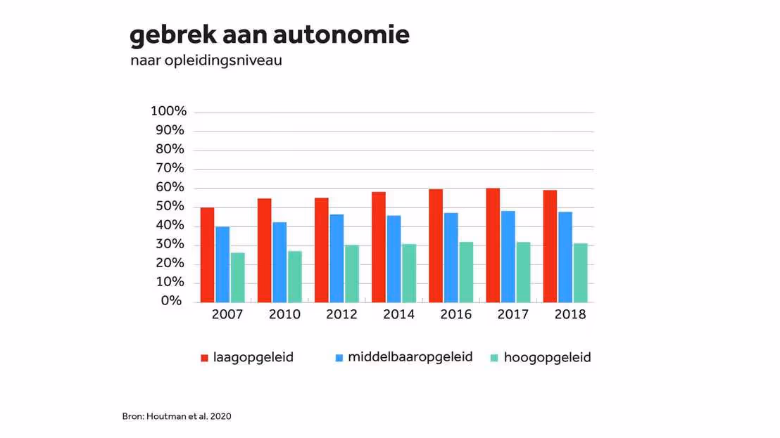 - Bijna de helft van de werkenden ervaart een gebrek aan vrijheid op het werk. Dat gebrek aan autonomie zorgt mede voor het hoge aantal mensen met burnoutklachten (17,5 procent).