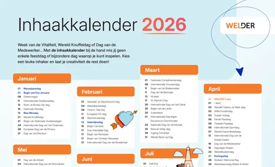 Knuffeldag, Relaxation Day, Wandel Tijdens Je Werk-dag… Ook in 2026 zijn er weer volop leuke themadagen die je binnen jouw organisatie kunt uitlichten. Met de nieuwste WELDER Inhaakkalender heb je een compleet overzicht van relevante HR-thema's in 2026! In het WELDER-platform vind je veel van deze acties kant-en-klaar terug, direct inzetbaar voor jouw interne communicatie.