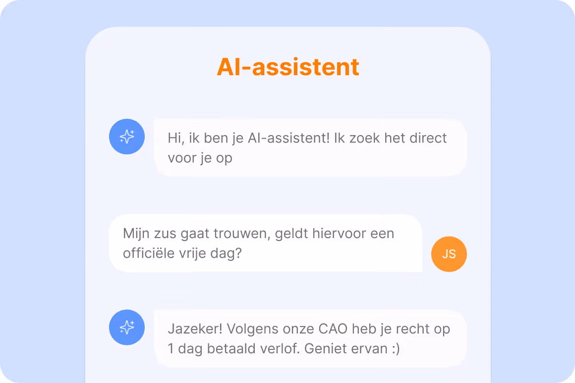 Je eigen AI-assistent beantwoordt alle vragen van jouw medewerkers direct en accuraat. Niet eindeloos zoeken in de kennisbank, maar snel en direct antwoord.