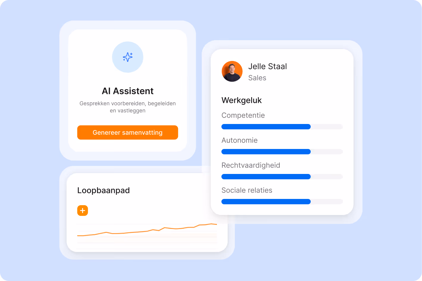 Mensen vertrekken sneller bij ouderwetse organisaties. Bespreek werkgeluk, stippel loopbaanpaden uit en evalueer prestaties. Volledig ondersteund met de laatste mogelijkheden in Artifical Intelligence.
